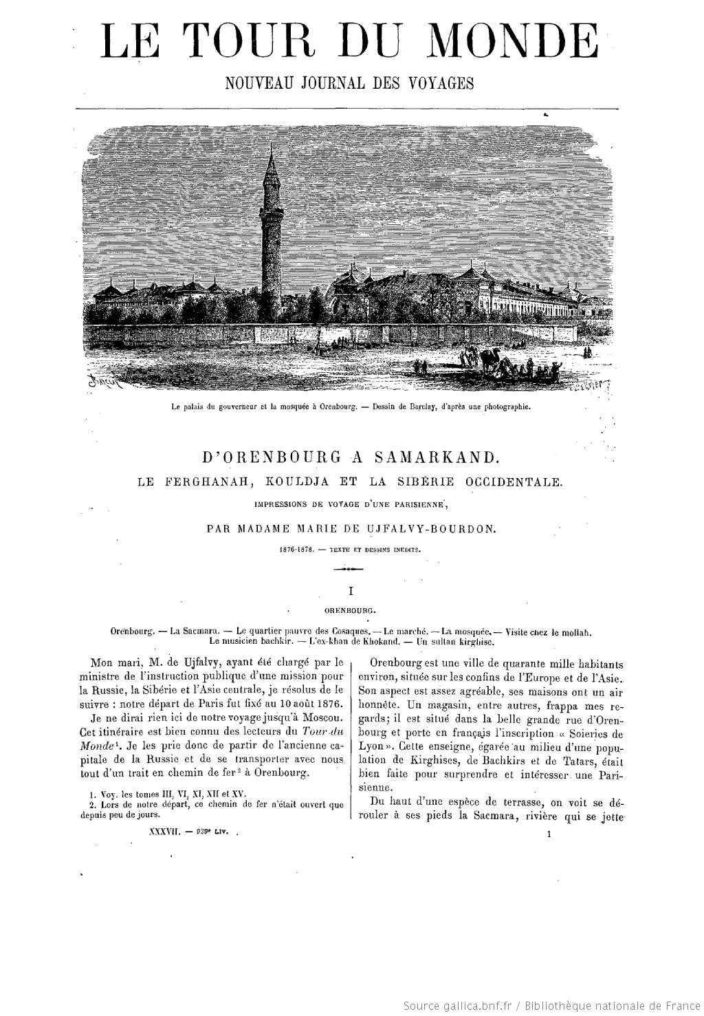 « D’Orenbourg à Samarkand », Le Tour du Monde, 1879, I, p. 1-96 ; 1879, II, p. 49-96.