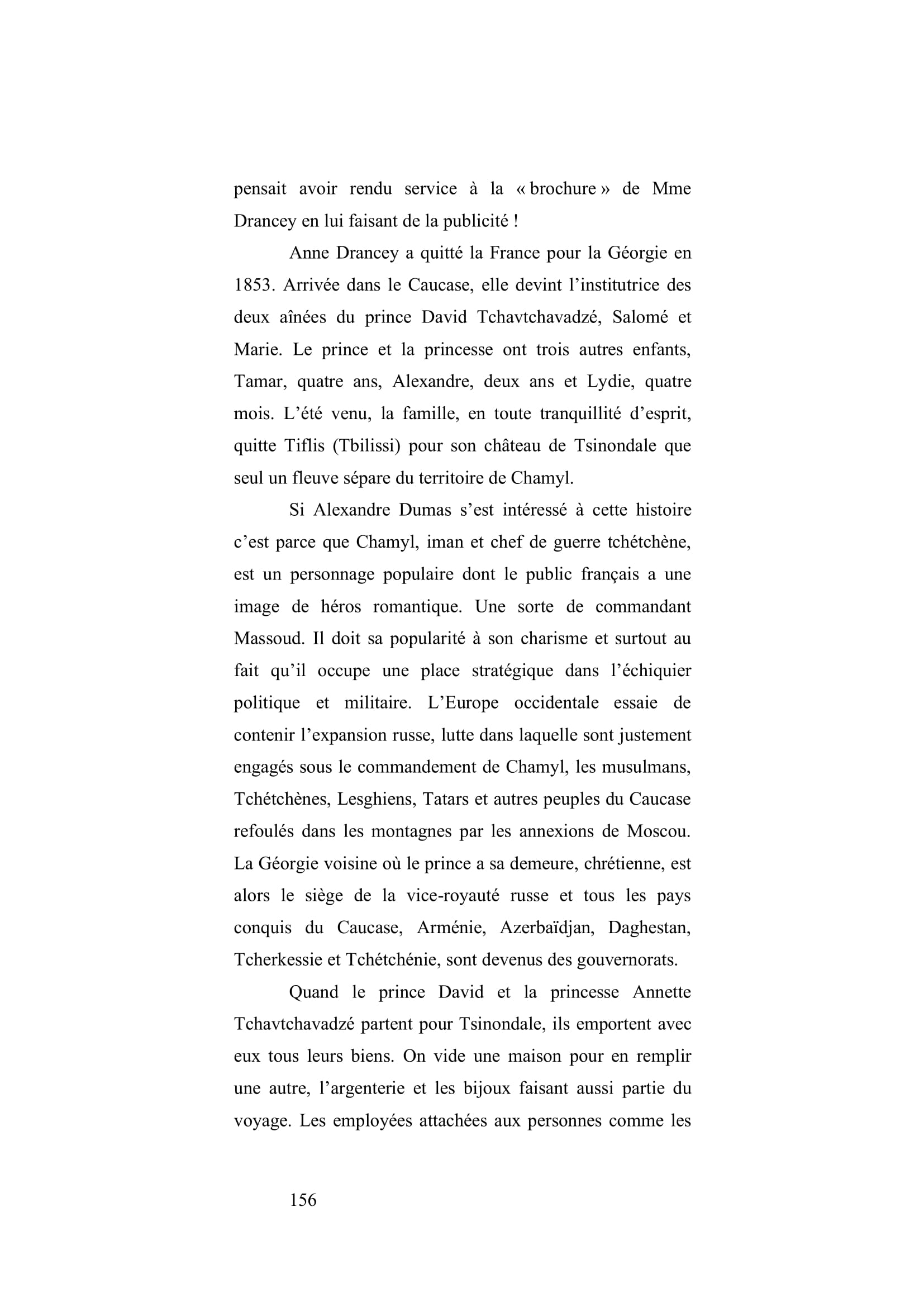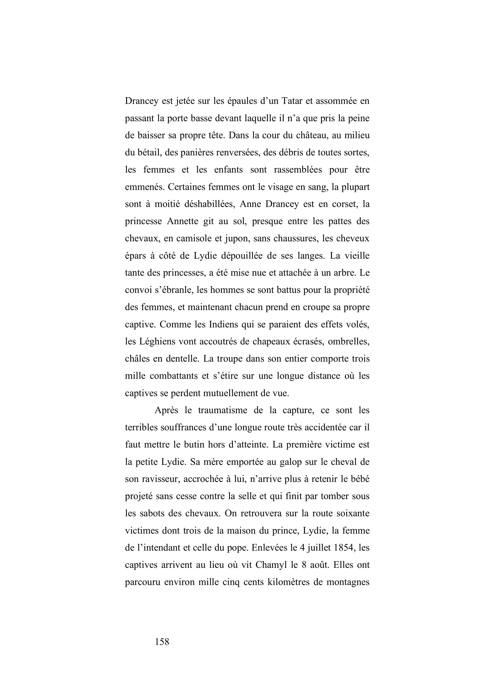 Institutrice française chargée de l’éducation de princesses géorgiennes, elle est faite prisonnière en 1854 par des Tchétchènes. Enlevée avec d’autres femmes et enfants de la cour, elle parcourt avec eux plus de mille cinq cent kilomètres dans les montagnes. Elle passera 7 mois de captivité jusqu’à sa libération contre un enfant de l’imam Chamyl (retenu otage à la cour de Russie) et une rançon importante. Son livre est un témoignage rare sur les mœurs des Tchétchènes et de la guerre qu’ils livraient contre le pouvoir du Tsar russe.