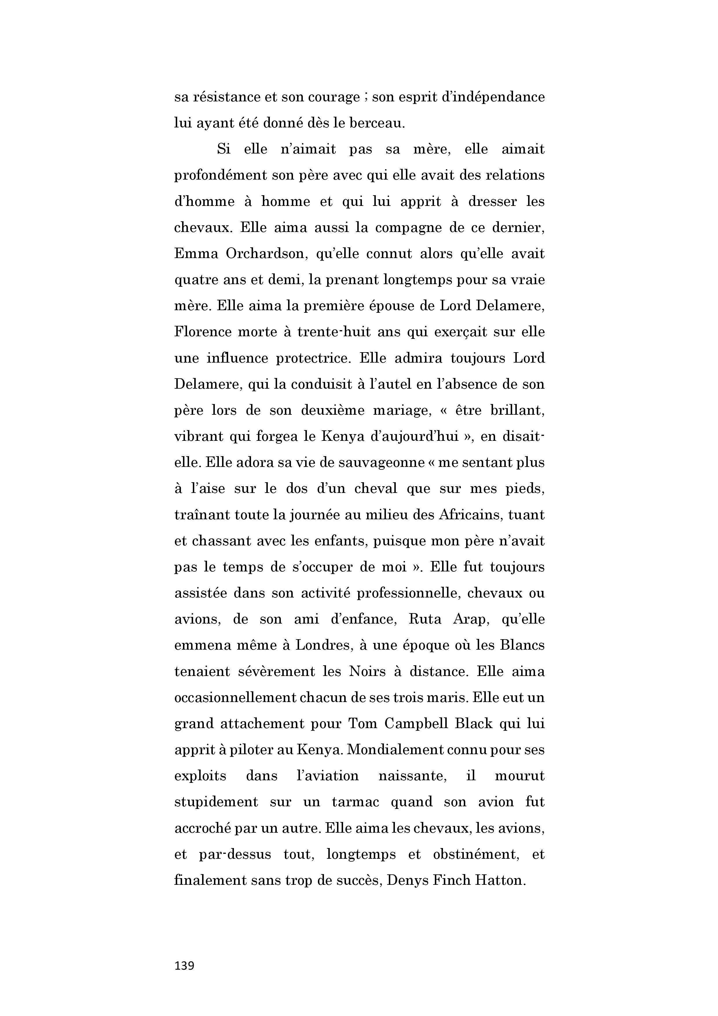 Ayant acquis un brevet de pilote commercial, elle gagne sa vie au Kenya, en transportant des marchandises et des personnes ainsi qu'en repérant le gibier pour les guides de chasse et leurs riches clients.