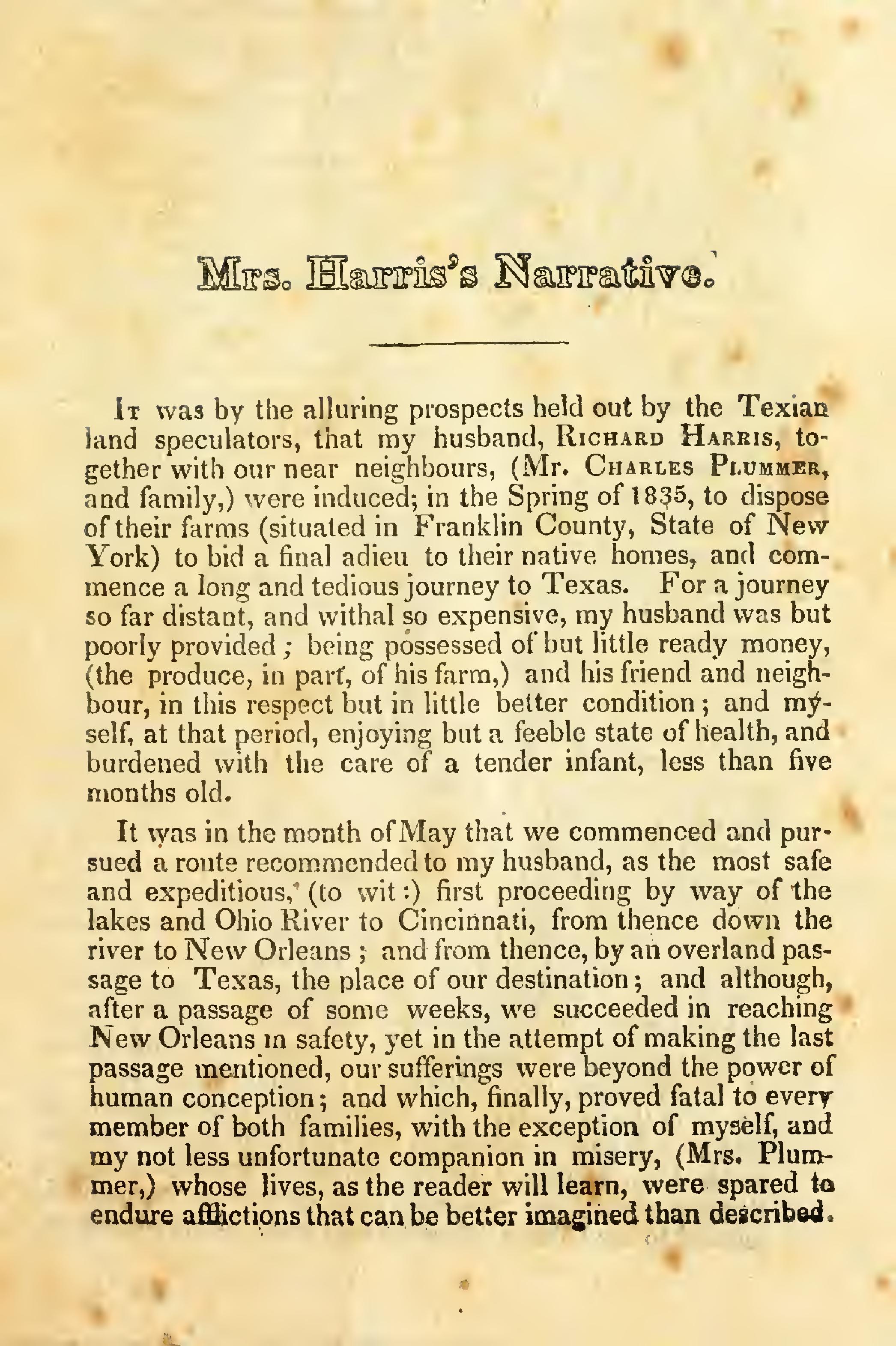 History of the captivity and providential release there from of Mrs. Caroline Harris, wife of the late Mr. Richard Harris, of Franklin Co, state of New York, who, with Mrs. Clarissa Plummer were in the spring of 1835 taken prisoners by the Camanche, tribe of Indians, while emigrating, New York, Cunningham, 1838