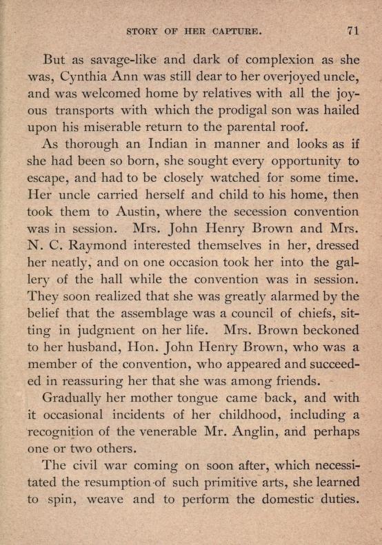 Personnage célèbre de l'histoire américaine, enlevée au Texas à 9 ans et adoptée par les Comanches, elle fut pleinement indianisée. Elle se maria et eut deux enfants avec son mari Indien, chef guerrier reconnu. Retrouvée et récupérée par sa famille blanche, elle essaya obstinément de s’enfuir et finit par se laisser mourir de faim.