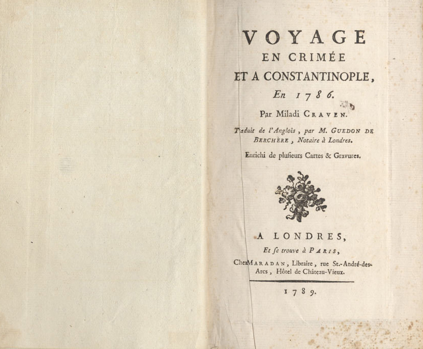 Voyage en Crimée et à Constantinople en 1786, par Miladi Craven, traduit de l'anglais par M. Guédon de Berchère, Londres et Paris, Maradan, 1789.