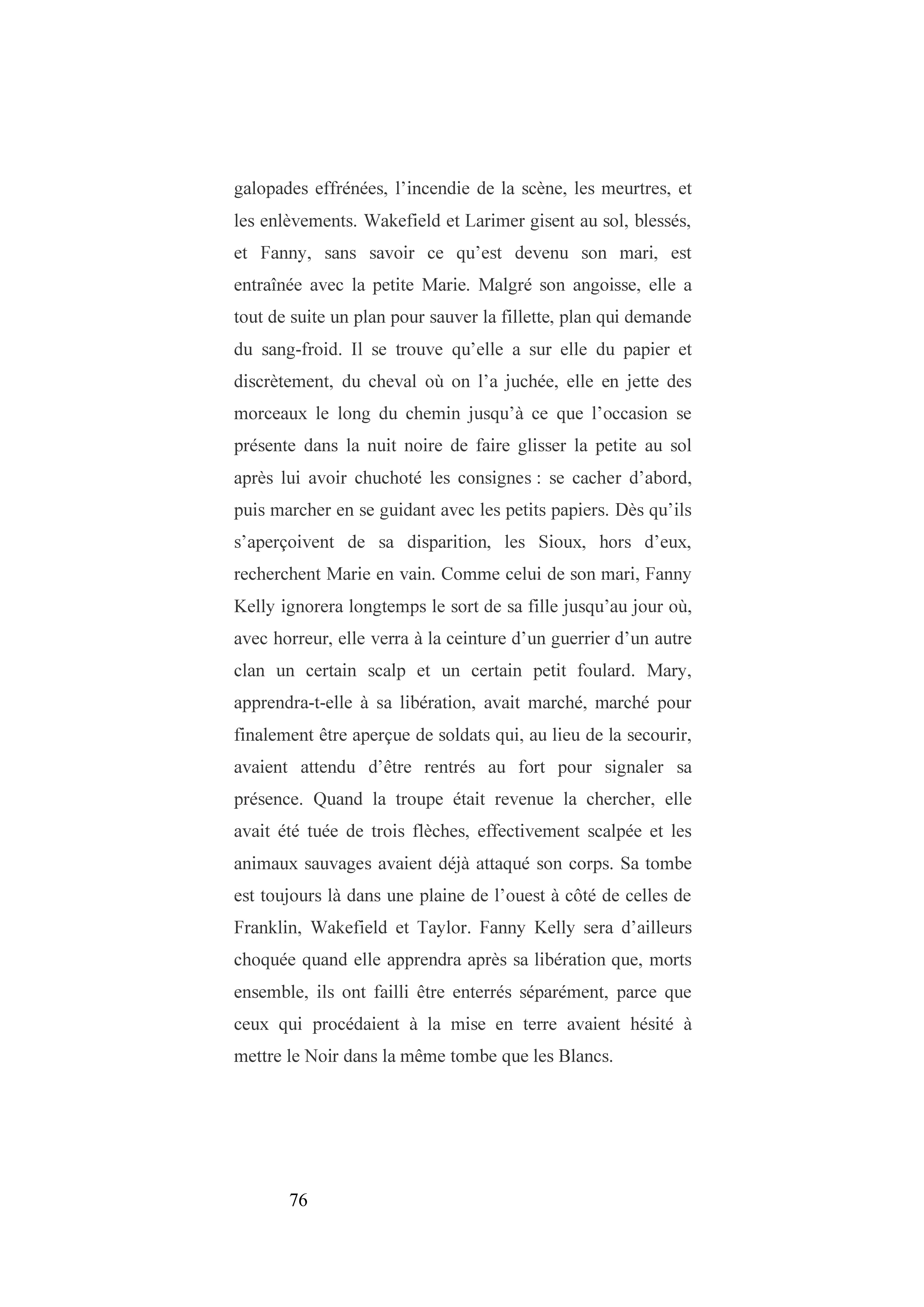 Capturée par les Sioux dans le Montana en 1864, en pleine ruée vers l’ouest alors qu’elle part s’installer dans l’Idaho avec son mari et leur fille. L'attaque est effroyables : son mari et la plupart de leurs compagnons de route sont tués. Sa fille est abattue quelques jours plus tard, en tentant de s’échapper. Fanny Kelly a écrit un remarquable ouvrage sur ce drame personnel et historique faisant une grande place à ses observations sur les mœurs des Indiens dont elle a compris le malheur corollaire.