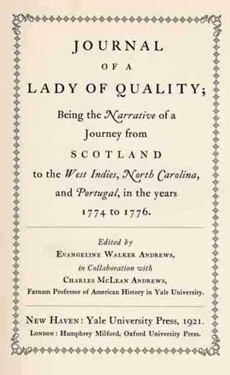 Journal of a lady of quality being the Narrative of a journey from Scotland, to the West Indies, North Carolina and Portugal, in the years 1774 to 1776, Présenté par Evangeline Walker Andrews, en collaboration avec Charles McLean Andrews, New Haven, Yale University Press, 1921