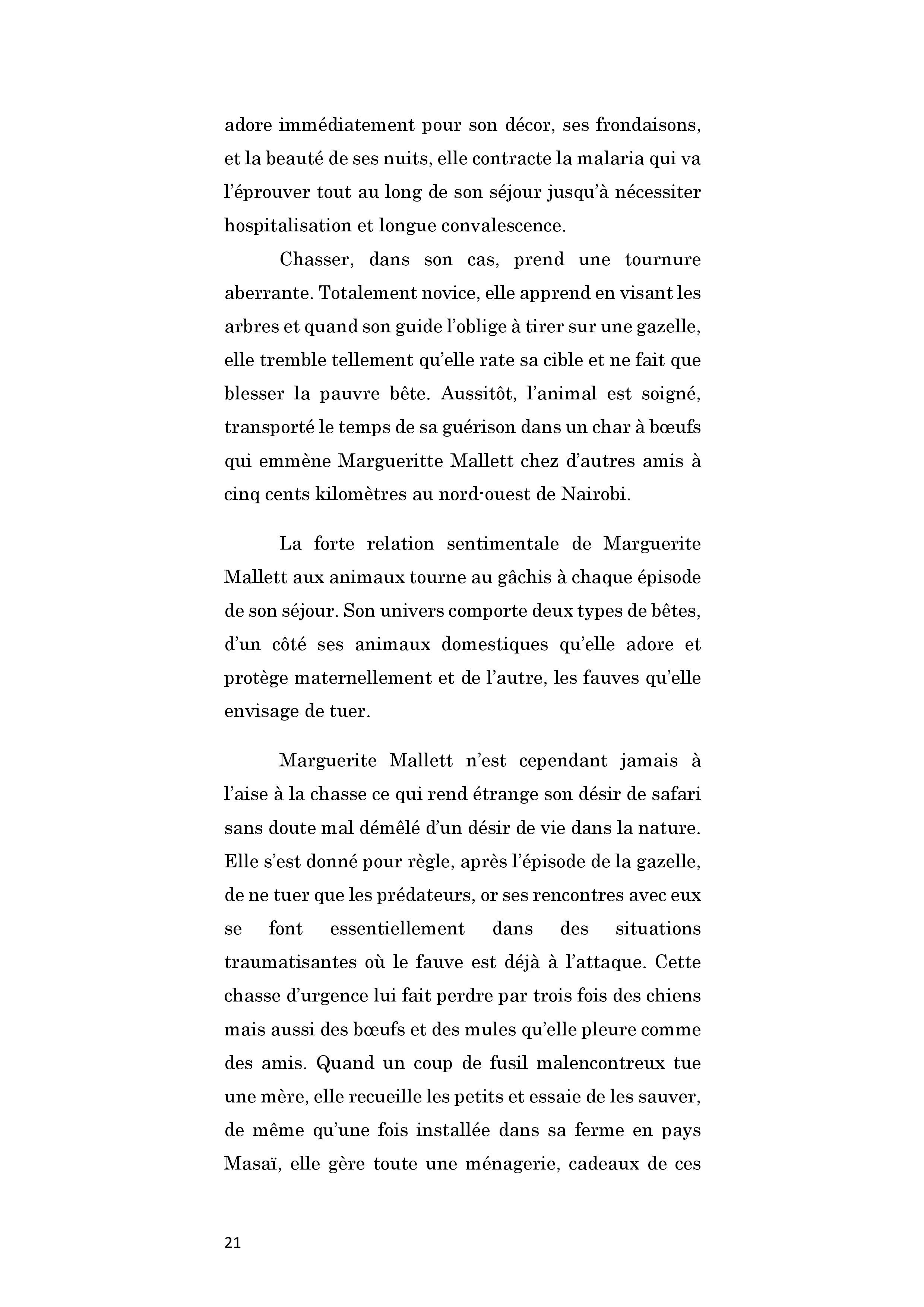 Elle débarque en Afrique de L’Est en 1915 juste à la fin de la première guère mondiale, âgée de 45 ans, infirmière jusque là et célibataire. Elle voyage d'abord puis s’installe, semble-t-il car son récit est sur ce point très elliptique, comme colon en pays Masaï. Elle chasse mais se montre peu douée. Très attachée à ses animaux domestiques, elle essaie elle-aussi de repenser, dans ce contexte, sa relation aux animaux ce qui l'amène sauver chaque fois qu'elle le peut des bébés animaux de la brousse laissés sans défense. Son séjour en Afrique est difficile, la malaria la terrasse et sa ferme est brûlée dans une insurrection. Elle aussi, développe dans son livre des observations sur les mœurs de Masaï, mais surtout sur une ethnie beaucoup moins connue, les Nandis.