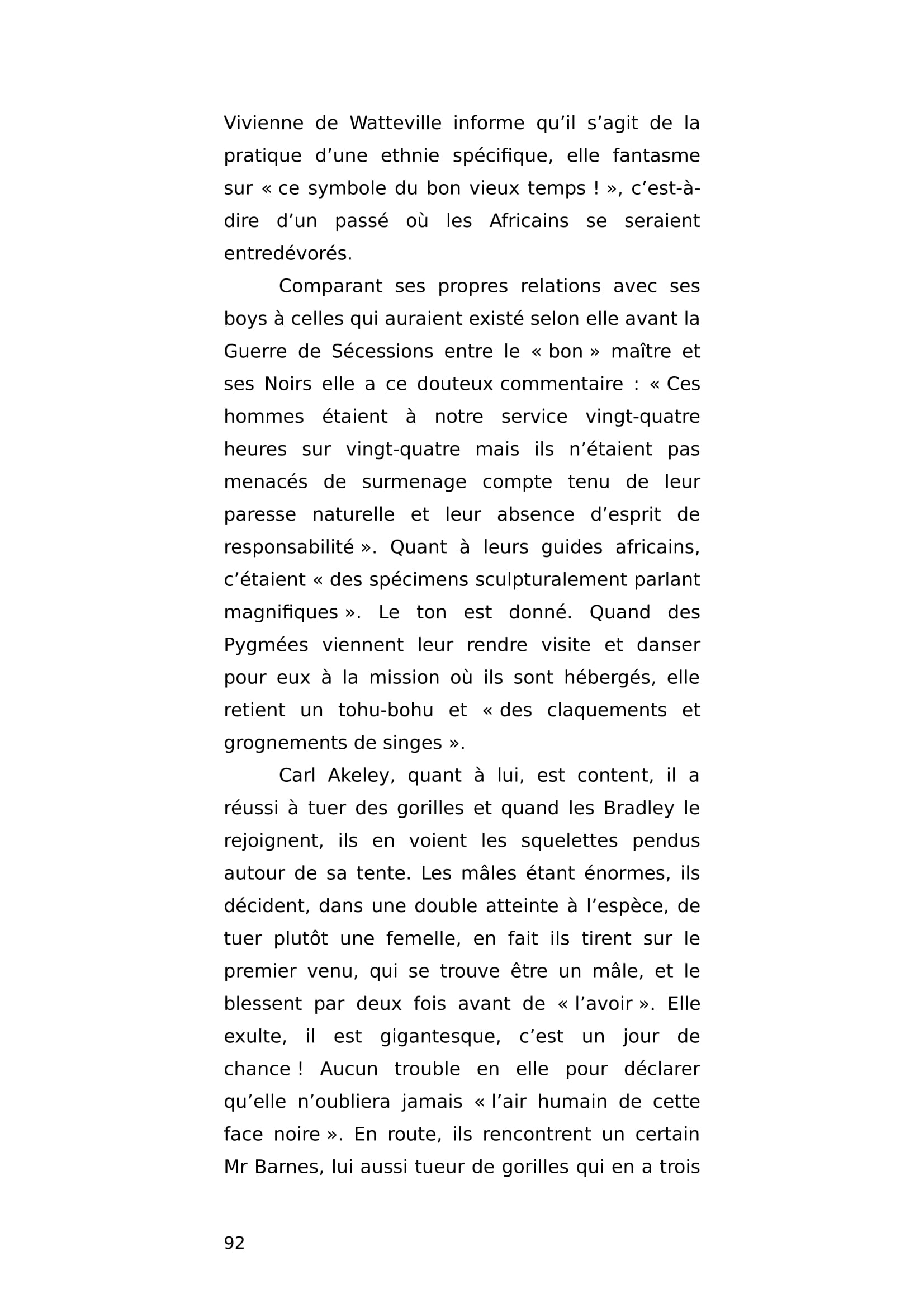 Riche et célèbre romancière américaine, Mary Hastings Bradley pratique ses premiers safaris au début des années 20 au Rwanda, au Congo et au Kenya. Sous l'autorité de Carl Akeley, elle et son mari tuent des chimpanzés alors qu'ils savent l'espèce déjà menacée. Fantasmant pas mal sur le cannibalisme, elle raconte sa gloire de chasseuse intensive et sa fierté de faire suivre sa fille dans plusieurs ouvrages dont un destiné aux enfants. Pendant la deuxième guerre mondiale, dans un tout autre registre, elle témoignera sur la condition spécifique des femmes et la libération des camps.