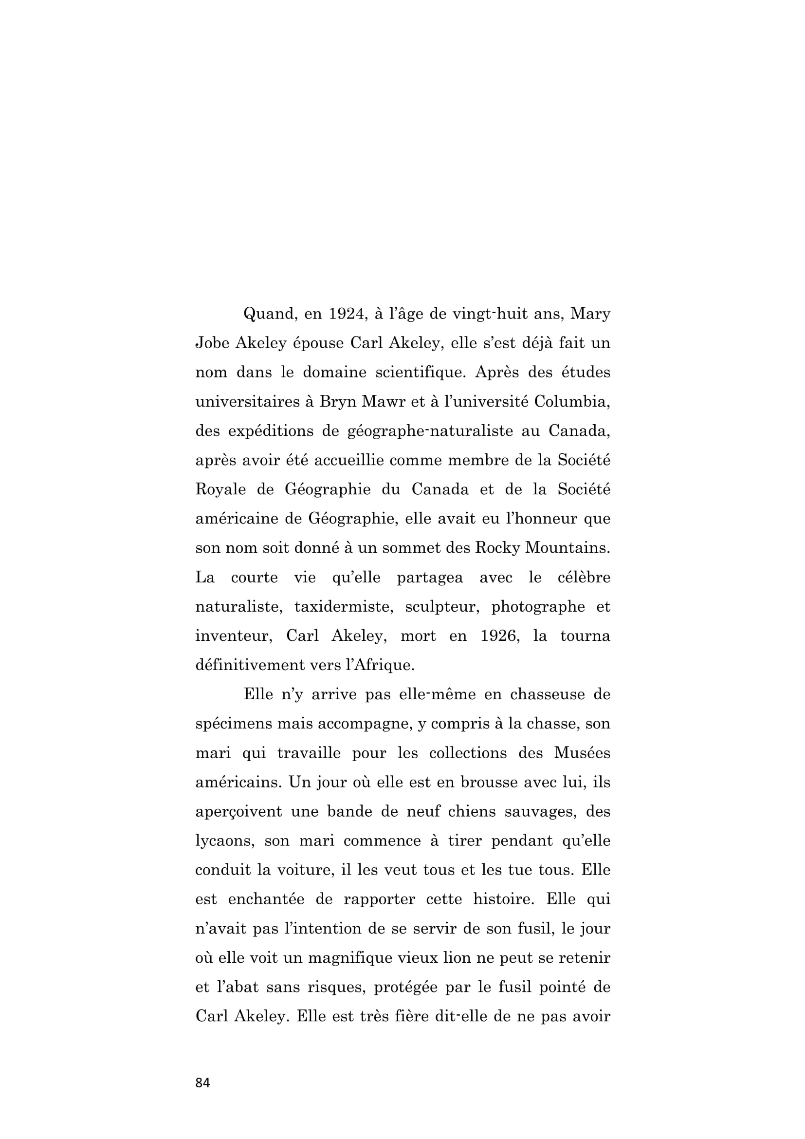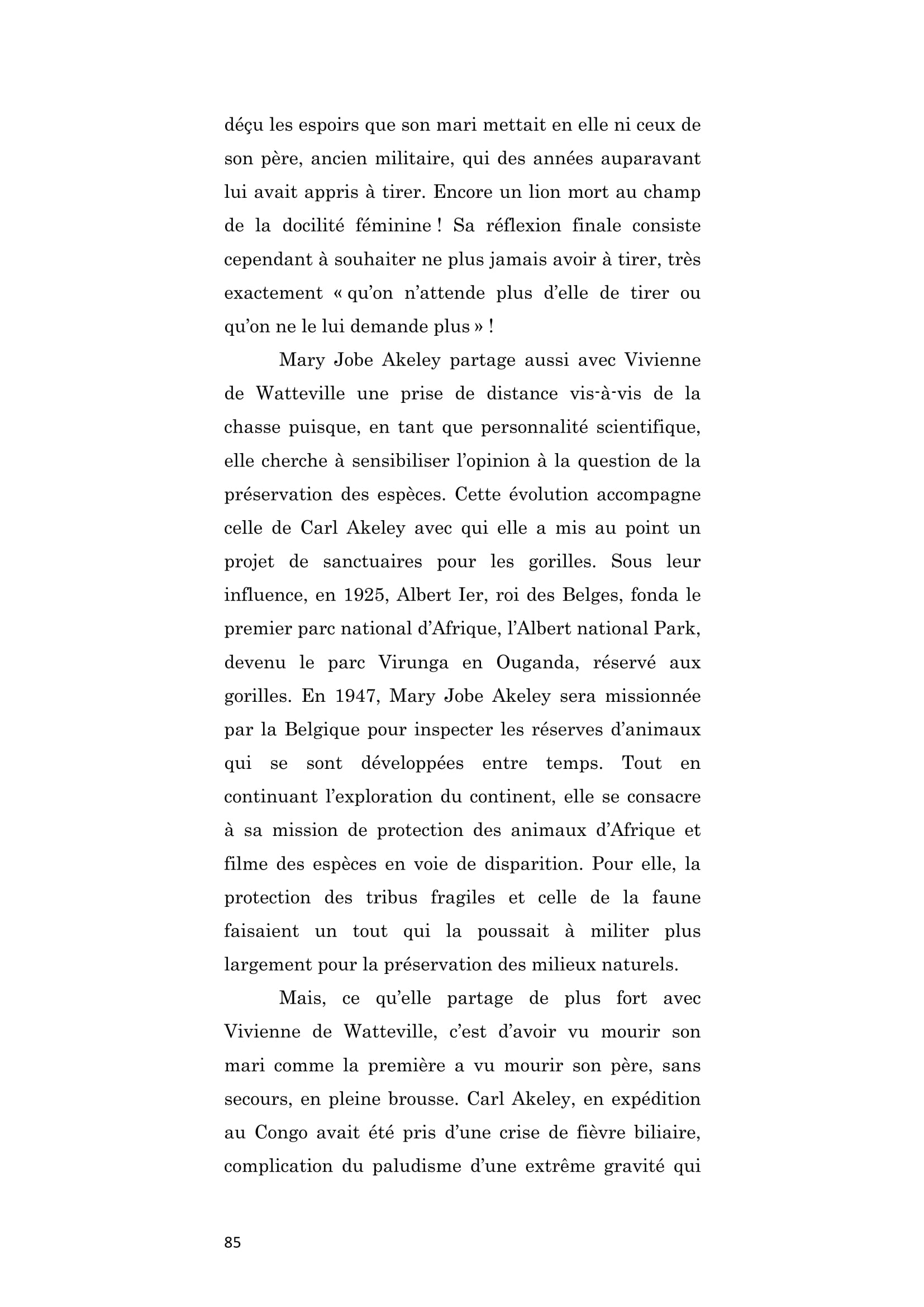 Américaine. Grande scientifique, seconde épouse de Carl Akeley avec qui elle s'est mariée en 1924, c'est avec lui qu'elle participe à son premier safari en 1926. La même année, Carl meurt mais Mary Jobe continuera à parcourir le Congo belge, l'Uganda et le Tanganyika. Renonçant à la chasse avide telle qu'il la pratiquait, elle agira désormais pour la préservation des espèces e facilitant, entre autres, la création des réserves.