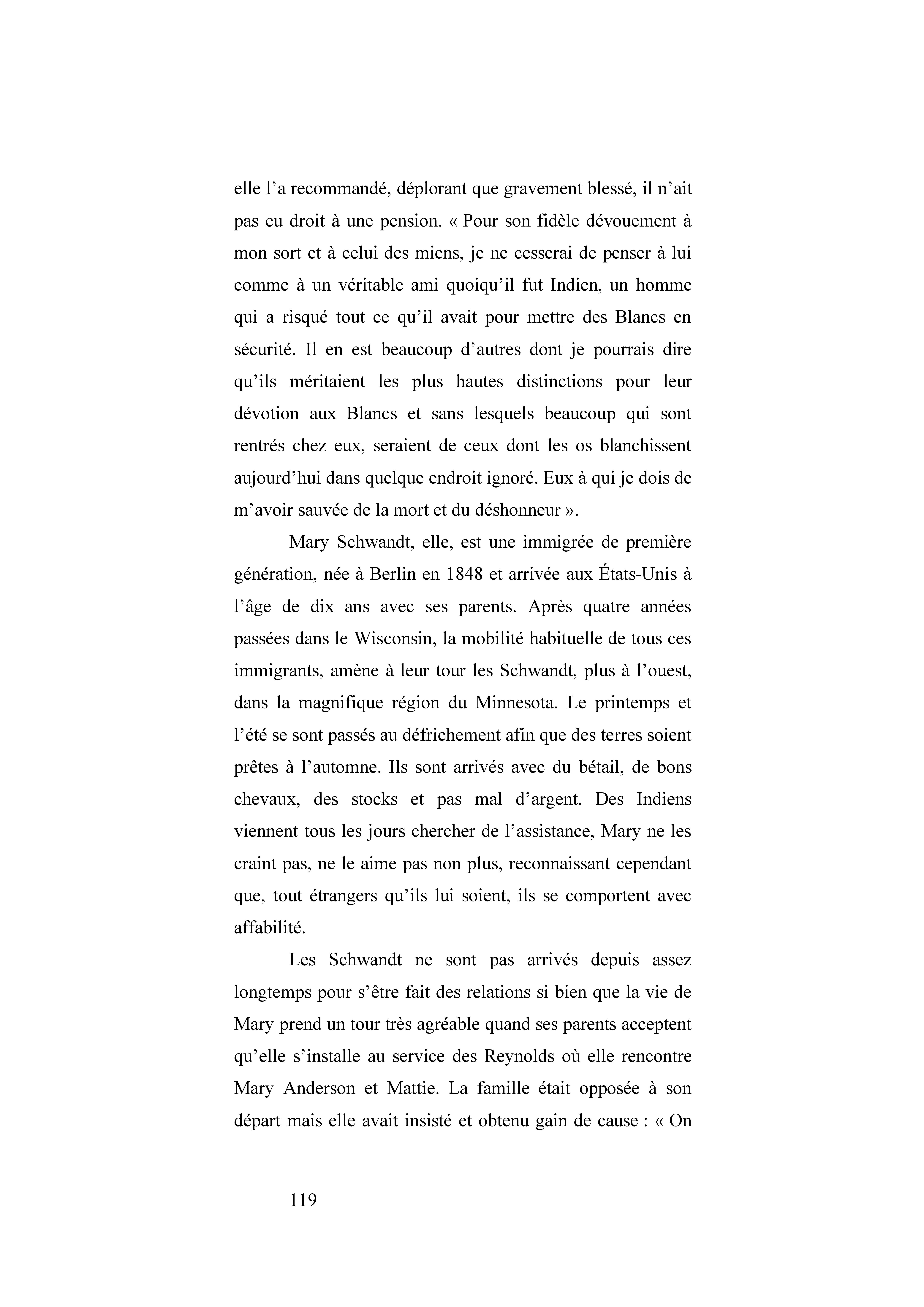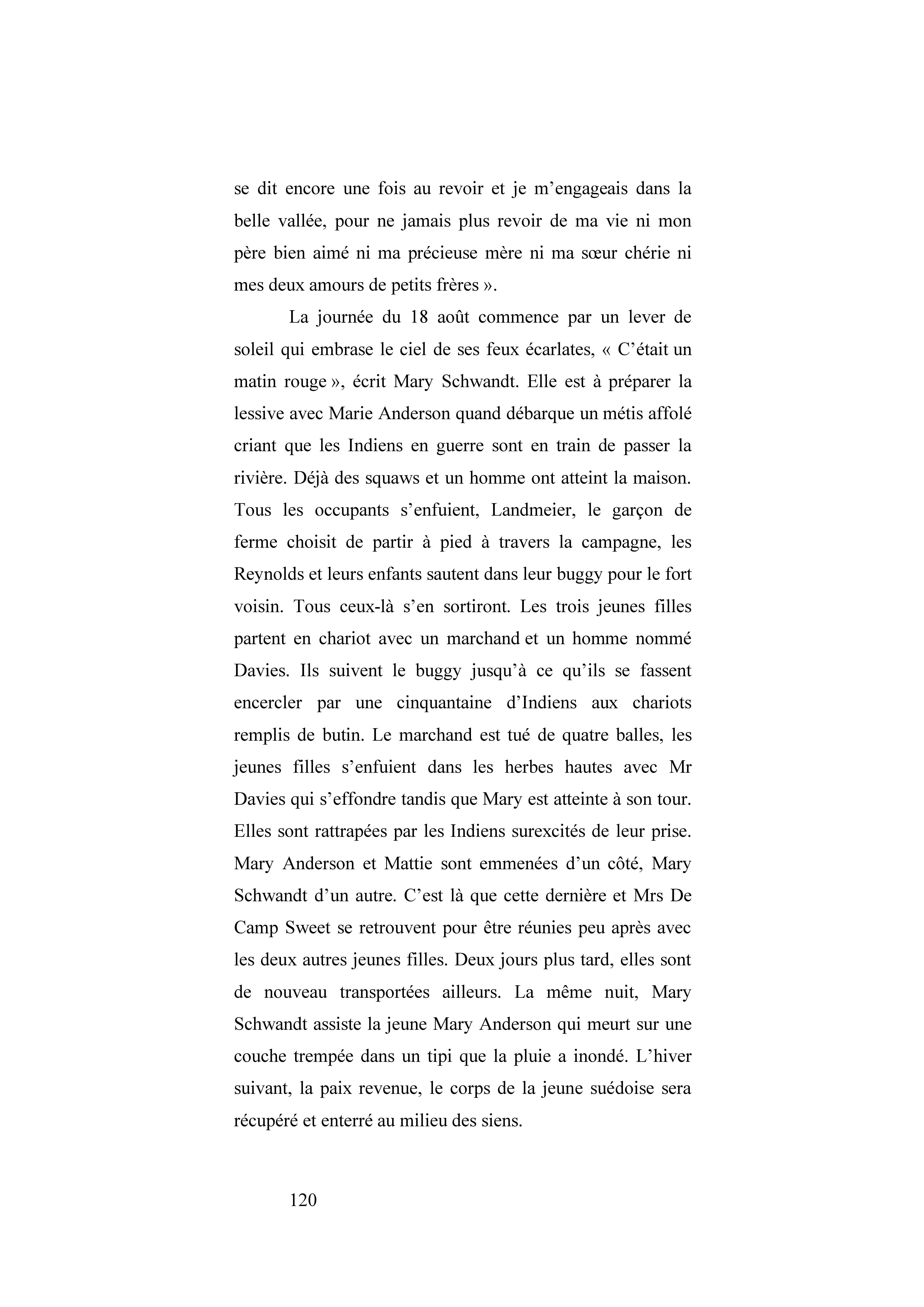 Née en Allemagne, elle s’installe avec ses parents dans le Minnesota. Elle a 16 ans quand elle décide d’aller travailler au service de voisins chez qui elle se fait capturer : c’est le début de la Guerre des Dakotas. Elle comprend au Camp indien de Little Crow où elle est internée que ses parents se sont fait dépouiller et tuer. Elle doit sa survie à l’aide d’une vielle squaw et sa fille converties. Elle publie son récit en 1894.