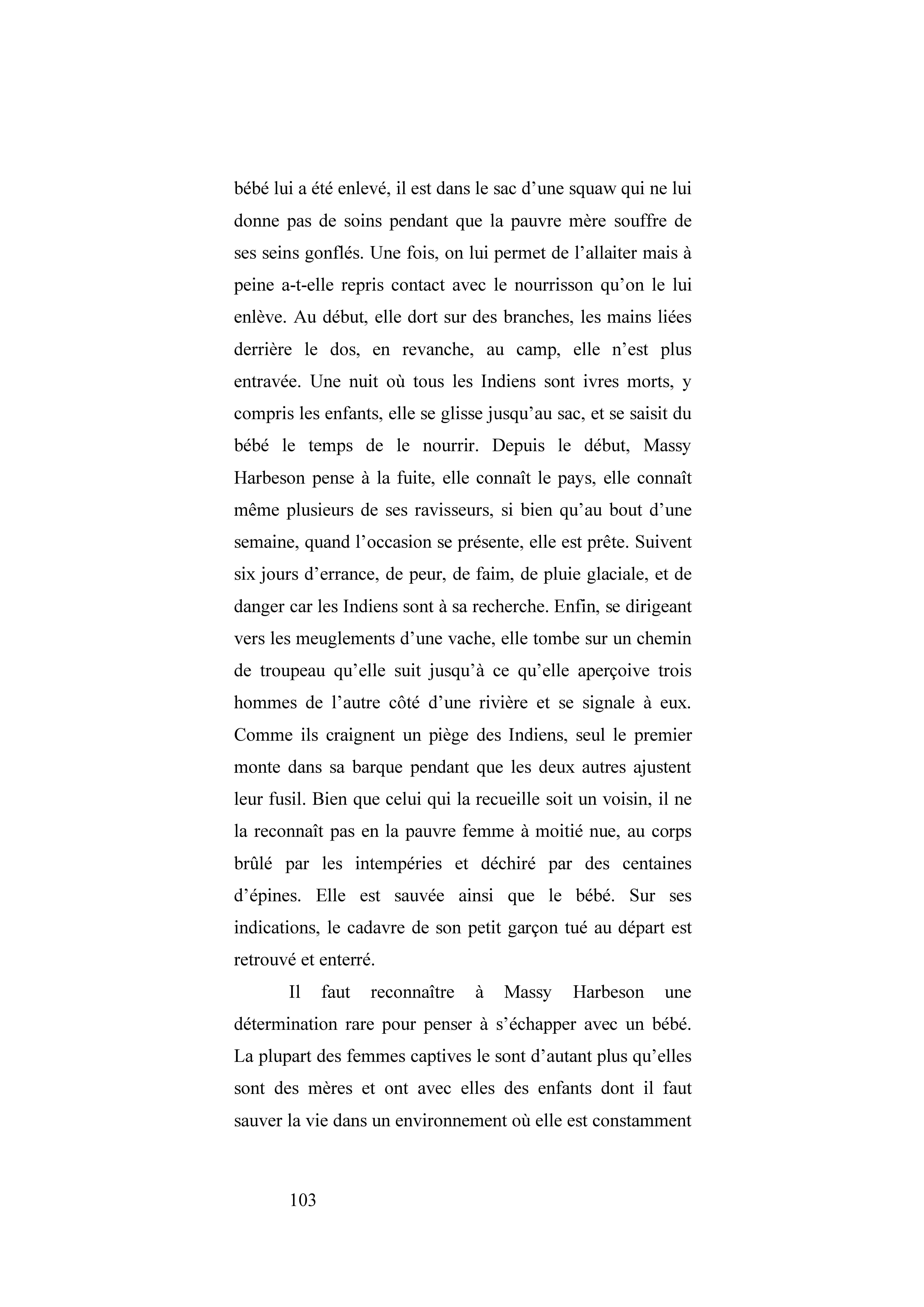 Née d’une famille pionnière aux USA, elle décide de s’installer en Pennsylvanie. En 1791, elle est réveillée en pleine nuit par une attaque d’Amérindiens. Un de ses enfants en bas âge est tué et scalpé. Elle entame un long voyage avec son nourrisson maltraité lui aussi vers un camp indien mais, une semaine après sa capture, elle arrive à s’échapper. Après une errance d’une semaine, elle est recueillie avec son bébé par un Blanc, rare ou seul cas de mère ayant réussi une évasion.
