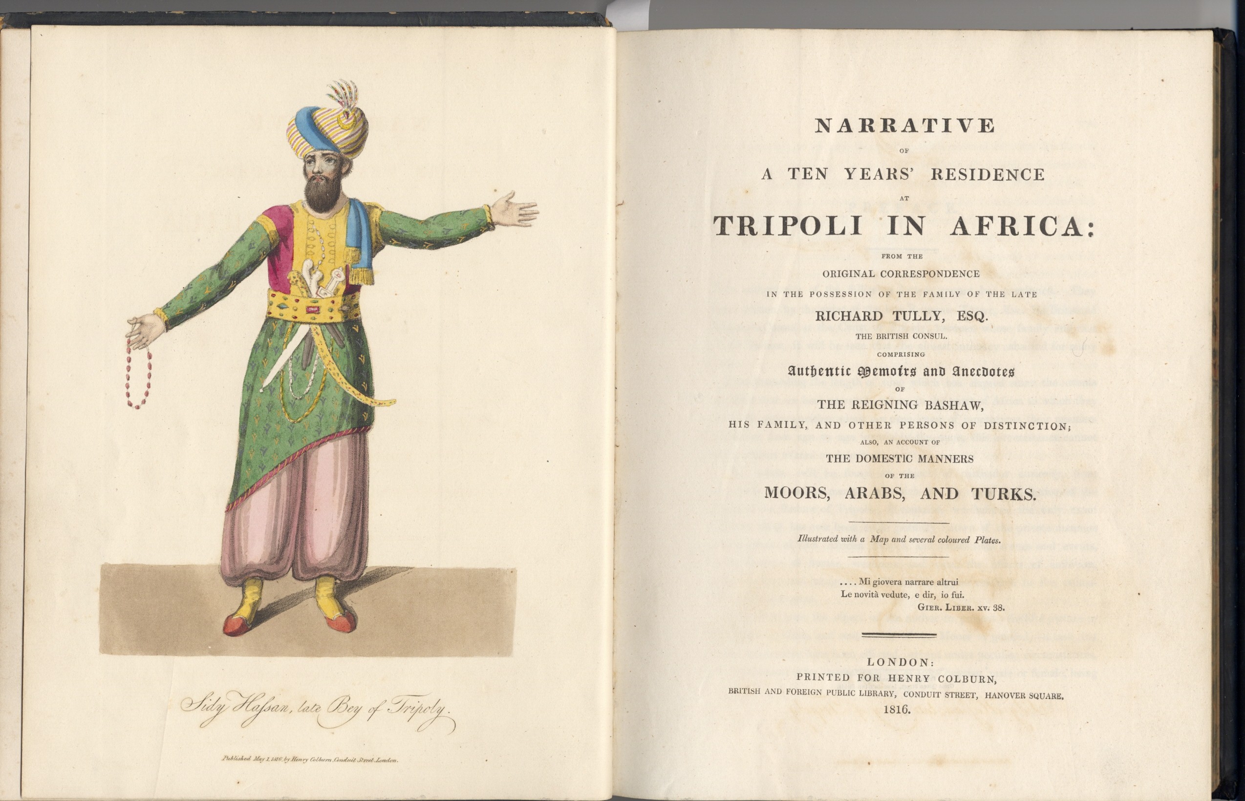 Narrative of a ten years residence at Tripoli in Africa, from the original correspondence in the possession of the family of the late Richard Tully, the British consul, comprising authentic memoirs and anecdotes of the reigning bashaw, his family and other persons of distinction, also an account of the domestic manners of the Moors, Arabs and Turks, London, H. Colburn, 1816