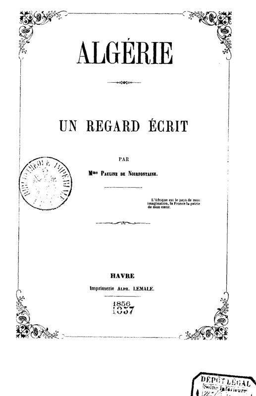 Françoise Pauline Lafond, veuve de Castor Chas, épouse en 1847, Alfred Bodson de Noirfontaine, lieutenant colonel du Génie. Femme de lettres, elle tient salon à Paris. Quelques années en Algérie lui donnent l'occasion d'un témoignage sensible et de belle écriture sur la vie coloniale.