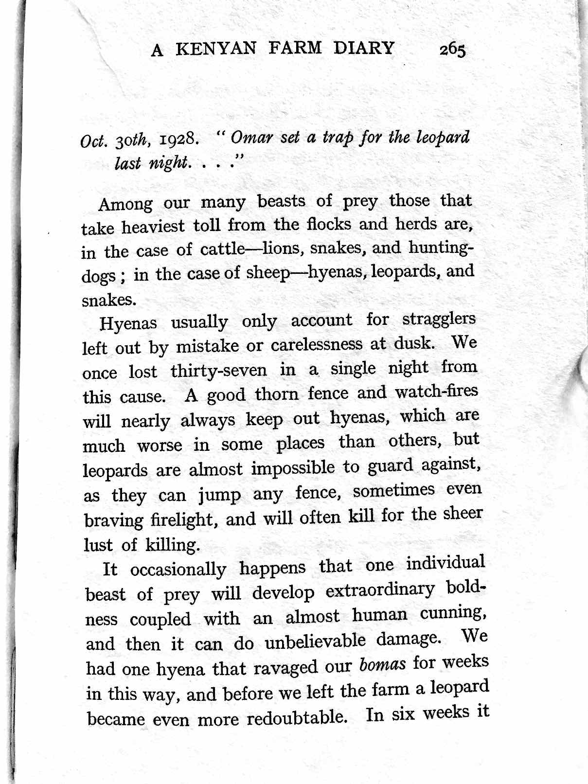 Britannique. En 1913, elle rejoint son mari militaire au Kenya. Ils créent une ferme d’élevage d’ovins. La rentabilité de l’entreprise est rendue très difficile par les attaques répétées des parasites, maladies et autres prédateurs. Peu portée sur la chasse, elle ne se réjouit que lorsque son mari tue des fauves qui s’approchent trop près des troupeaux. Elle a laissé un excellent témoignage sur la vie quotidienne des colons et leur difficile engagement dans des entreprises exigeantes physiquement et à haut risque économique, ses relations avec les natifs kenyans paraissant notablement dépourvues de racisme.