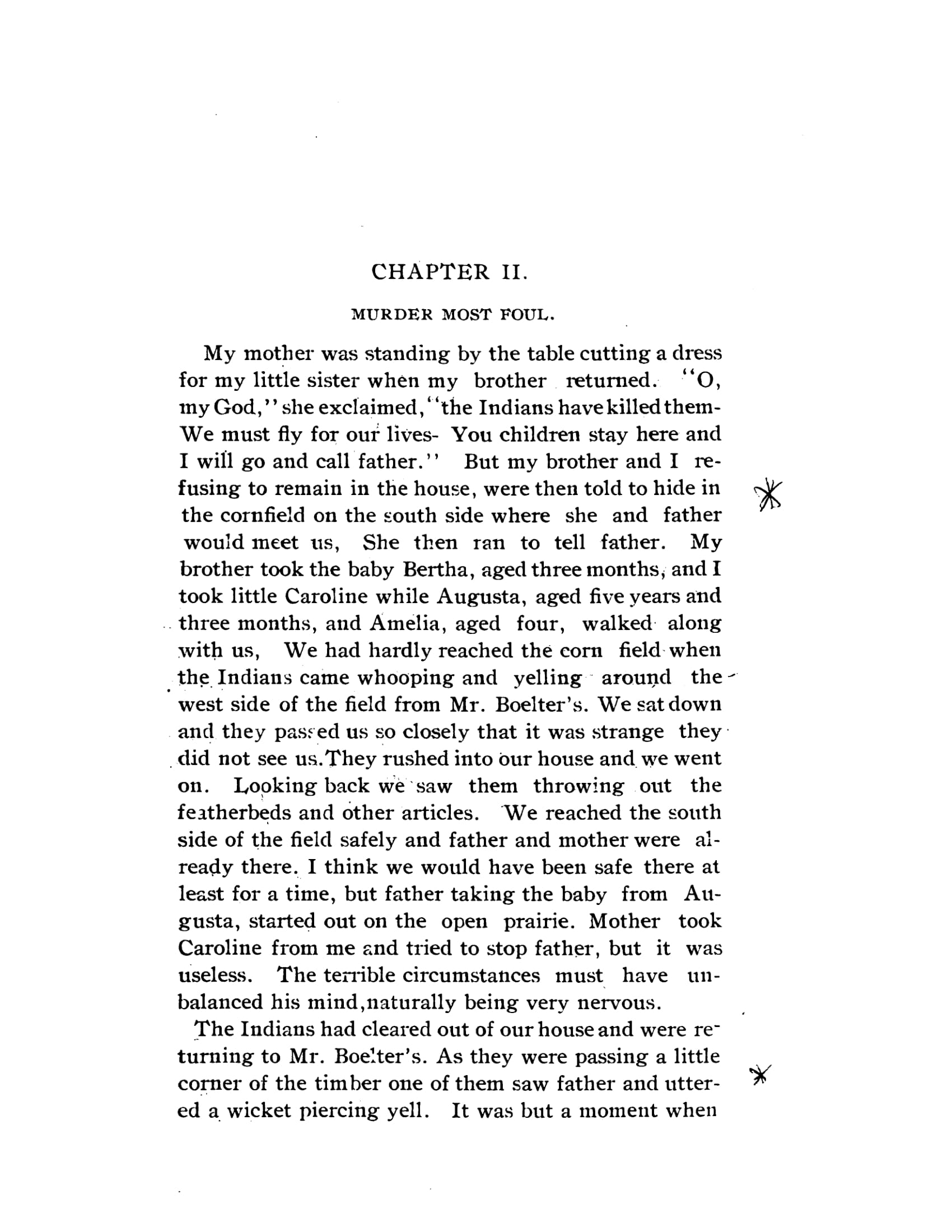 Ses parents fondent une petite communauté d’origine allemande dans le Minnesota. En 1862, alors que le nombre de colons n'a cessé de croître, les Sioux attaquent. Elle a sept ans et voit une bonne partie de sa famille assassinée. Quelques mois plus tard, l'armée libère le camp indien où elle est retenue et elle doit faire face à son statut d’orpheline. Elle est recueillie pour un temps par le prêtre de sa paroisse avec sa sœur et son frère. Ce dernier assistera à la pendaison des Indiens organisée en représailles et s’engagera dans l’armée pour les combattre. Elle publie son récit de captive 40 ans après les faits.